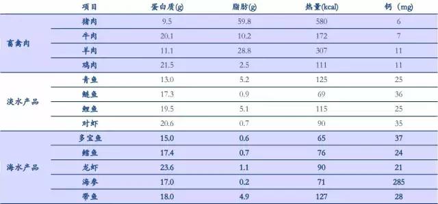 水產(chǎn)品是優(yōu)質(zhì)的食物蛋白源,與肉蛋類食物存在互換性。根據(jù)中國營養(yǎng)學(xué)會(huì)數(shù)據(jù),將居民經(jīng)常食用的豬牛羊雞等肉類與青魚、鰱魚、鯉魚和對蝦等淡水產(chǎn)品以及多寶魚、鱈魚等海水產(chǎn)品的營養(yǎng)成分進(jìn)行對比,可以看到,海水產(chǎn)品的蛋白質(zhì)含量較為豐富,且具有低脂肪、低熱量和鈣含量高等優(yōu)勢。