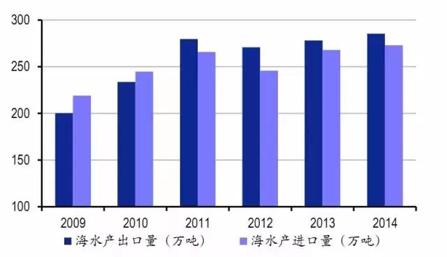 近年來我國海水產(chǎn)品進(jìn)出口規(guī)模穩(wěn)步增長,2014年海水產(chǎn)品進(jìn)口量為273.1萬噸,約占水產(chǎn)品進(jìn)口總量的64%;海水產(chǎn)品出口量為285.4萬噸,約占水產(chǎn)品出口總量的69%。