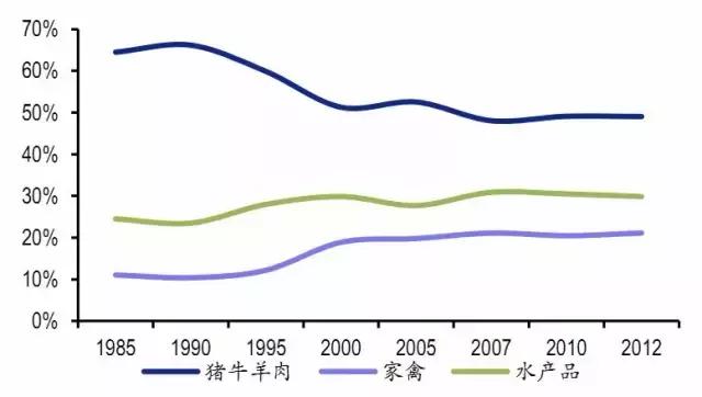 從國內(nèi)肉類消費(fèi)結(jié)構(gòu)的變化對判斷未來淡水產(chǎn)向海水產(chǎn)消費(fèi)升級趨勢有較好的參考價(jià)值。