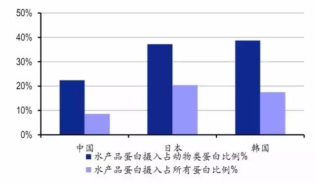 而與那些同飲食習(xí)慣相似的韓日等國比較,我國的人均水產(chǎn)消費(fèi)依舊偏低,水產(chǎn)品蛋白攝入量比重也較韓日有一定差距。