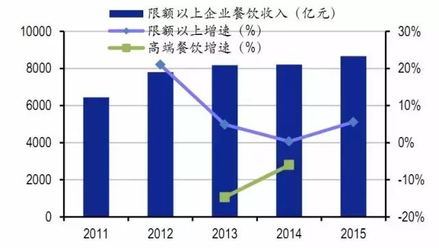在中央出臺八項(xiàng)規(guī)定的第二年,即是2014年,全國餐飲收入達(dá)2.79萬億元,同比增長9.7%,但其中高端餐飲營業(yè)額下降6%(上年下滑幅度為14.7%),人均消費(fèi)同比下降20%。