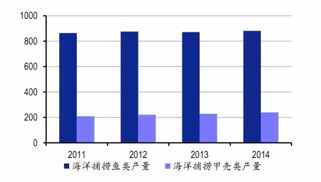 目前我國海水養(yǎng)殖總量已超過海洋捕撈總量,2014年海水產(chǎn)品產(chǎn)量3296萬噸,其中海水養(yǎng)殖產(chǎn)量1813萬噸,占比55%左右。海洋捕撈近年受近海過度捕撈和水域污染等影響,近年產(chǎn)量規(guī)模較為平穩(wěn),2014年海洋捕撈產(chǎn)量1280萬噸左右,占比在海產(chǎn)品供給總量的39%左右;遠(yuǎn)洋漁業(yè)捕撈產(chǎn)量則在203萬噸左右,占比不高,但以高價(jià)值海水產(chǎn)為主。