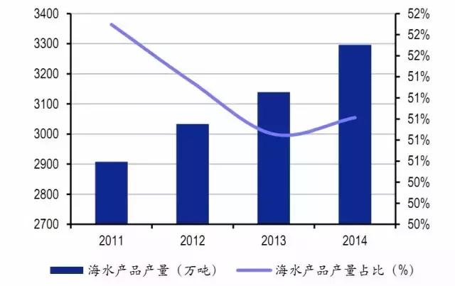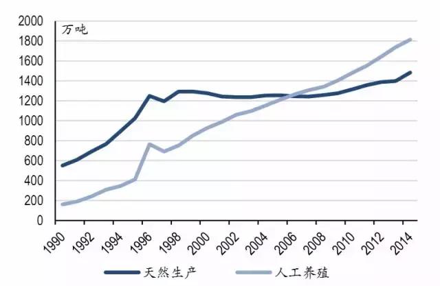 海產(chǎn)品供給當(dāng)中,人工養(yǎng)殖產(chǎn)量2006年首次超過海洋捕撈,2014年人工養(yǎng)殖海產(chǎn)品產(chǎn)量1812.65萬噸,超過捕撈量329萬噸,占海產(chǎn)品總產(chǎn)量比重55%。
