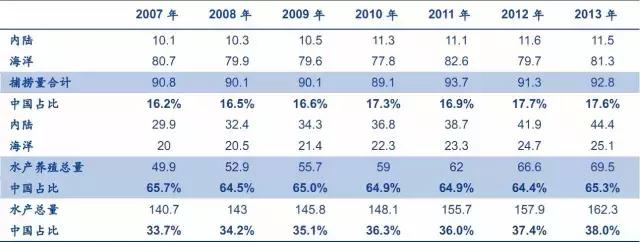 根據(jù)聯(lián)合國糧農(nóng)組織FAO數(shù)據(jù),2007-2013年全球水產(chǎn)養(yǎng)殖總量從49.9百萬噸增加至69.5百萬噸,水產(chǎn)捕撈量從90.8百萬噸小幅提高到92.8百萬噸,增量主要來自養(yǎng)殖。